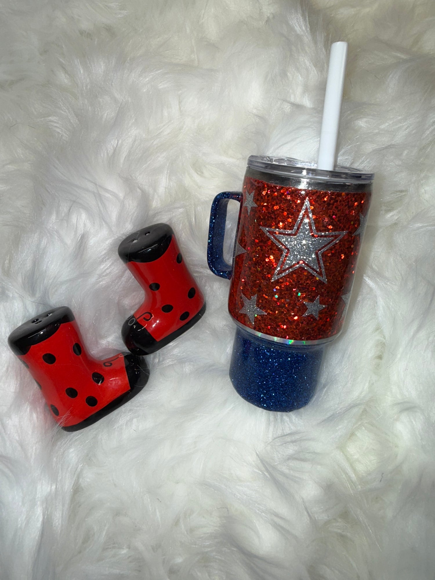 This distinctive 4oz tumbler boasts a stunning red and blue glitter finish embellished with shimmering silver stars, making it perfect for use as a memory cup or shot glass. It includes a lid and straw. Suitable for both festive occasions and daily use, this reusable tumbler adds a bit of sparkle to your drinkware assortment. An excellent choice as a distinctive gift or a personal indulgence—let every moment dazzle!