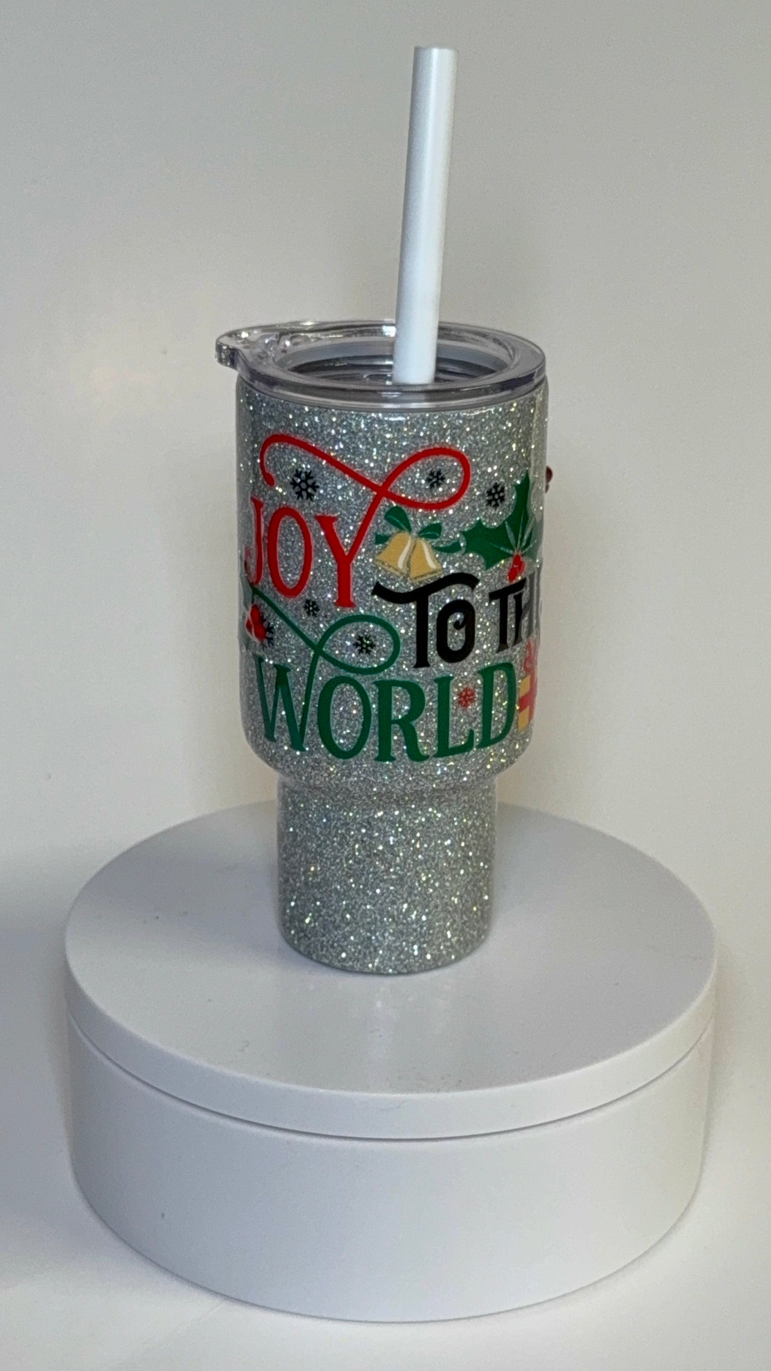 Infuse your holiday festivities with a touch of sparkle using our vibrate glitter mini Christmas tumbler! Decorated with radiant holly leaves, twinkling snowflakes, and the cheerful phrase 'Joy to the World', this tumbler serves as the ideal addition to your seasonal collection. Offered in a 4oz size it features a secure lid and straw. It is perfect for a memory cup, shot glass, espresso shot, or simply as a gift. Share holiday joy with each salute!