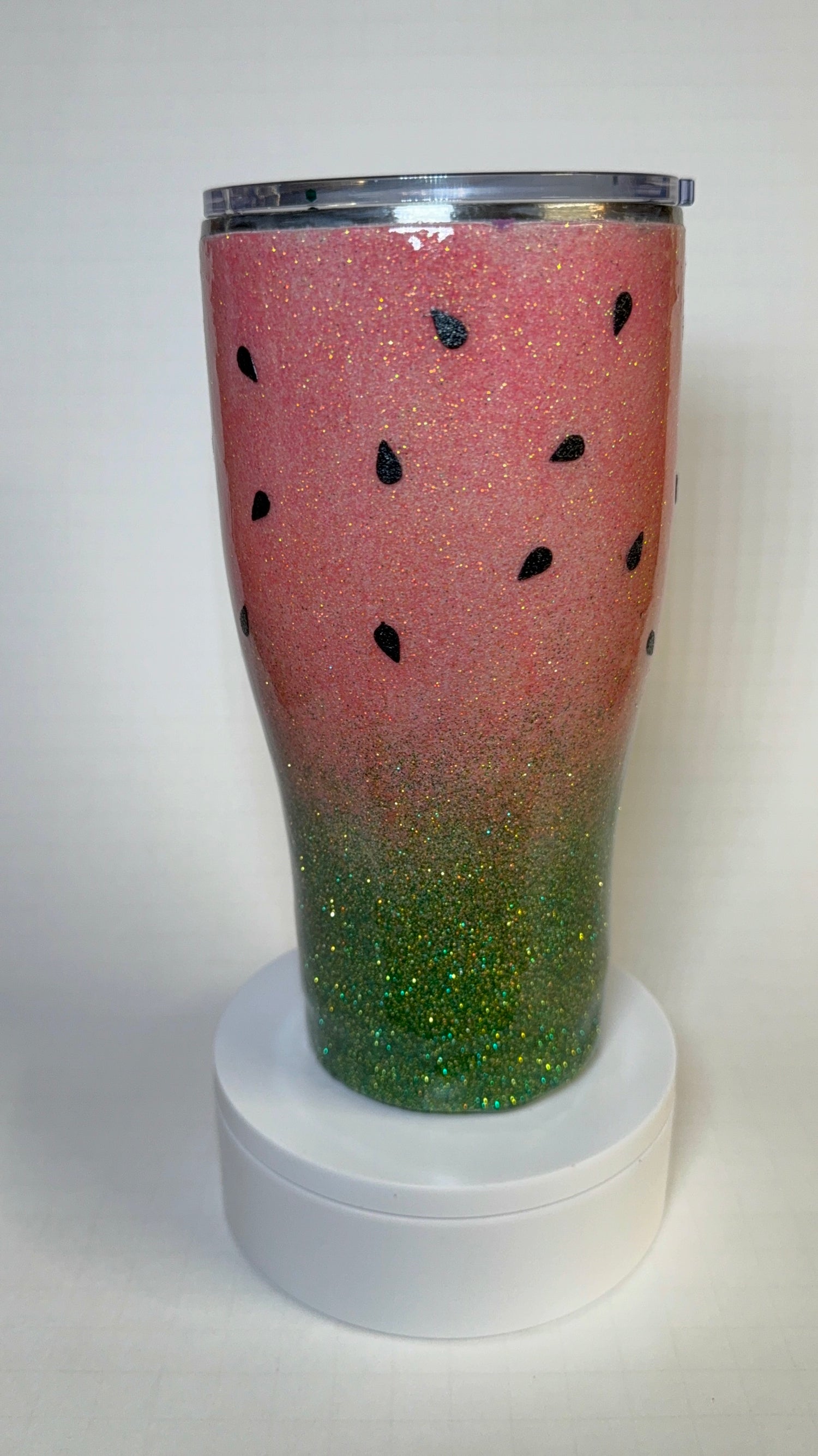 Add a splash of summer fun to your drinkware collection with our sparkling watermelon tumbler. Featuring an eye-catching pink glitter top, a vibrant green base, and playful black seed accents, this insulated cup is designed to make a statement. It keeps your beverages hot or cold for hours and has a generous 30oz capacity, making it ideal for coffee, tea, water, or your favorite cocktail. With a secure, clear lid to prevent spills, this delightful tumbler beautifully combines style and practicality—perfect for daily use at home, in the office, or when you're on the go.