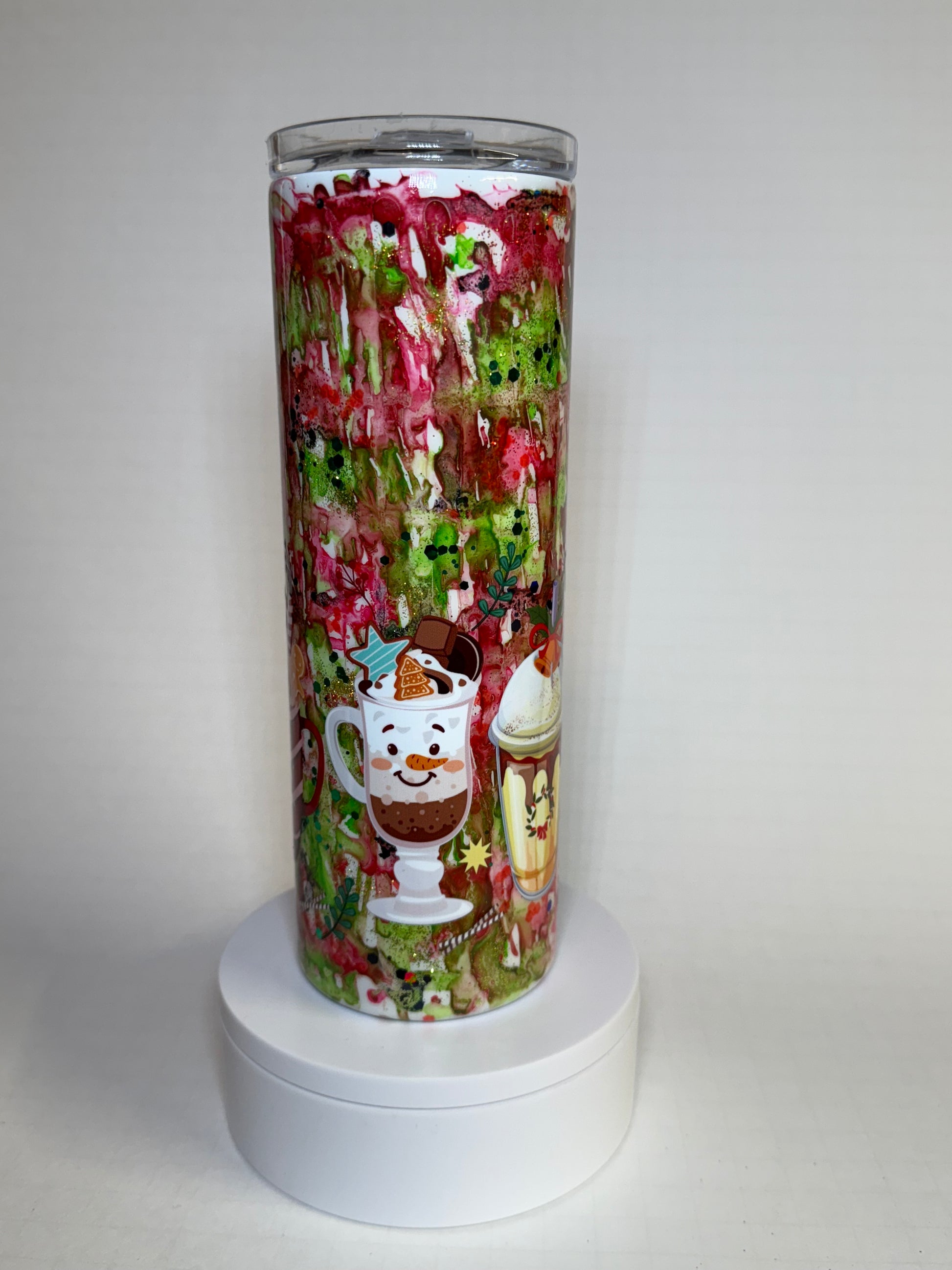 Enhance your drink experience with this beautiful hand-painted insulated tumbler, crafted to keep your beverages hot or cold for hours. The outside features vibrant splashes of red, green, and white, enriched by playful coffee cup illustrations for a fun, artistic flair. Offered in a handy 20oz size, this tumbler is perfect for coffee, tea, or your favorite cold beverages while on the move. Each piece is a distinctive work of art, making it a wonderful gift for creative individuals or anyone who enjoys standing out in style. Relish exceptional insulation, artistic charm, and unparalleled quality in every sip.