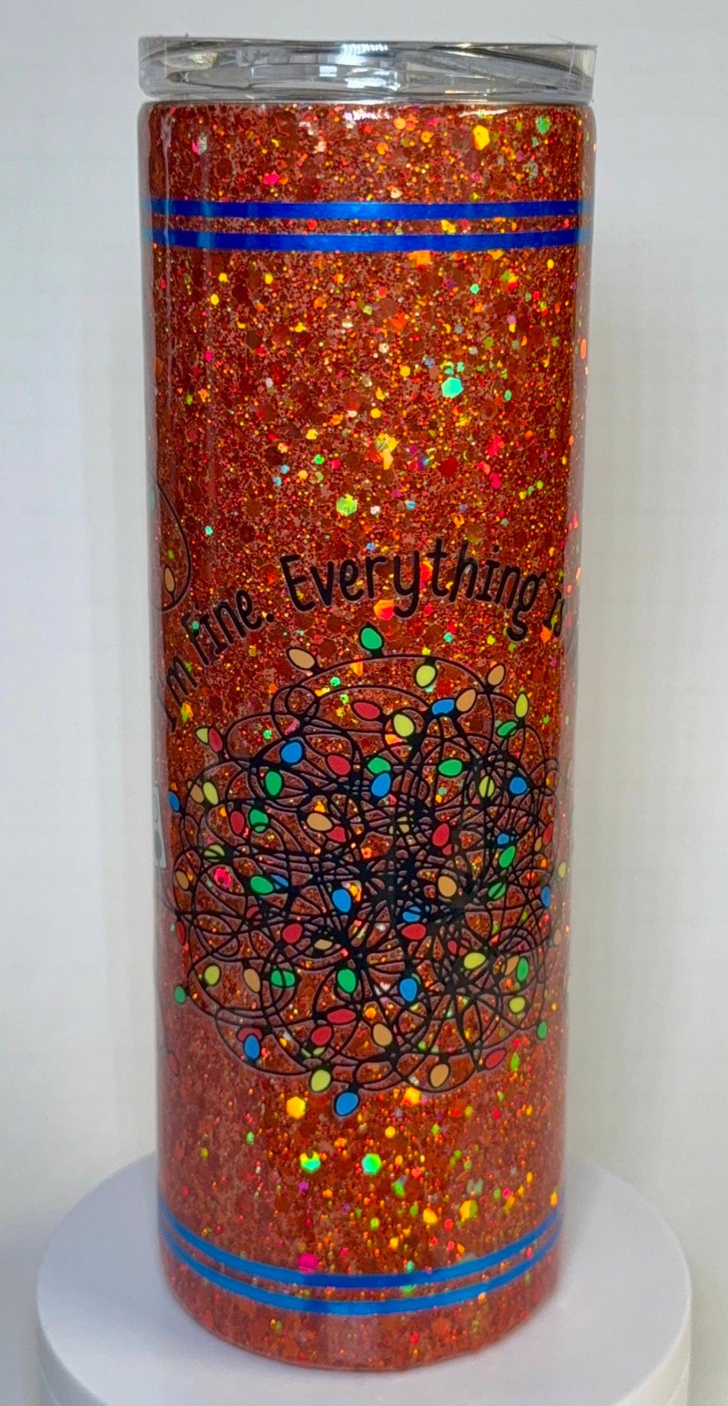 Our eye-catching orange glitter Christmas tumbler keeps beverages at the ideal temperature for hours and includes a crystal-clear lid and blue accent stripes for a contemporary look. With a generous 20oz capacity, it’s the perfect accessory for home or on-the-go. Make every sip a bold statement with this must-have tumbler! I’m Fine. Everything is Fine.